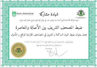 حيث كانت المشاركة بالبحث الموسوم ضبط النون الساكنة والتنوين في المصاحف القزانية الواقع والمأمول، والذي أقيم في مدينة قزان تترستان، في جمهورية روسيا الاتحادية.